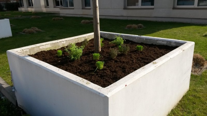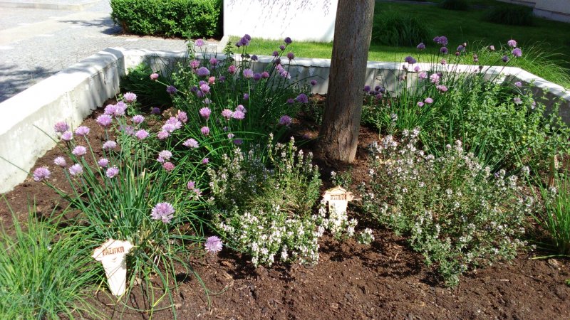 Před budovou G jsme pro Vás ve dvou květnících se stromy vysadili bylinky.